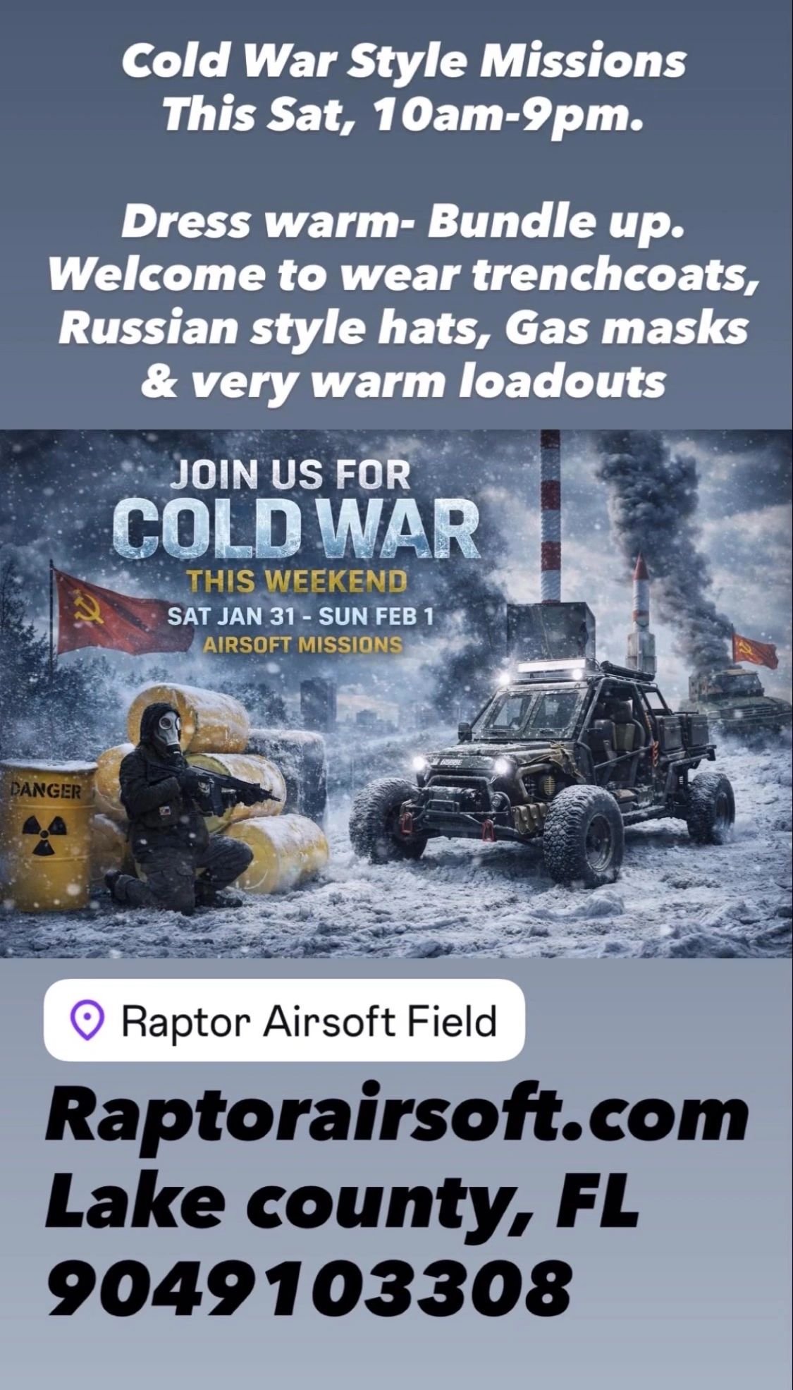 Call co-owner of Raptor Airsoft FIeld if you have any questions, Alcira Adriatico Samson 904-910-3308.